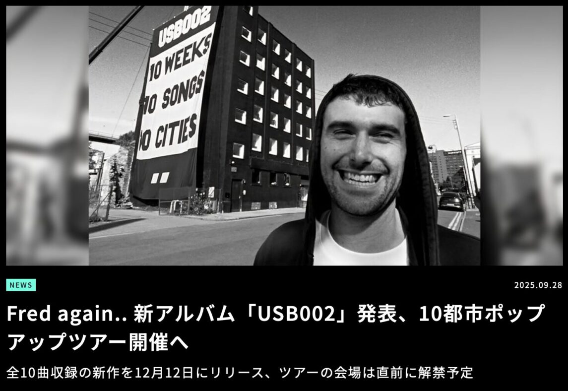 『USB002』は、Fred again..が提唱する“無限に変化するアルバム”プロジェクトの第二章にあたる。前作USB(のちにUSB001と改名)を拡張する形で、今回は「10週間で10都市を巡り、毎週1曲ずつ新曲を発表する」という構想を掲げ、リリースとライブを連動させたユニークなプロジェクトとして注目を集めている。シリーズは12月中旬までに全曲が公開される予定だ。