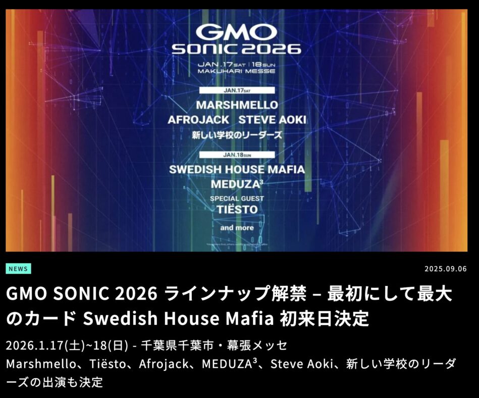 同日には Swedish House Mafia、MEDUZA、Tiësto らも出演予定。さらにDAY1には Marshmello、Afrojack、Steve Aoki の出演も決定しており、世界のトップアーティストが集結するGMO SONIC 2026は、2026年の幕開けを象徴する国内最大級のミュージックフェスとして大きな注目を集めている。