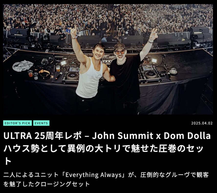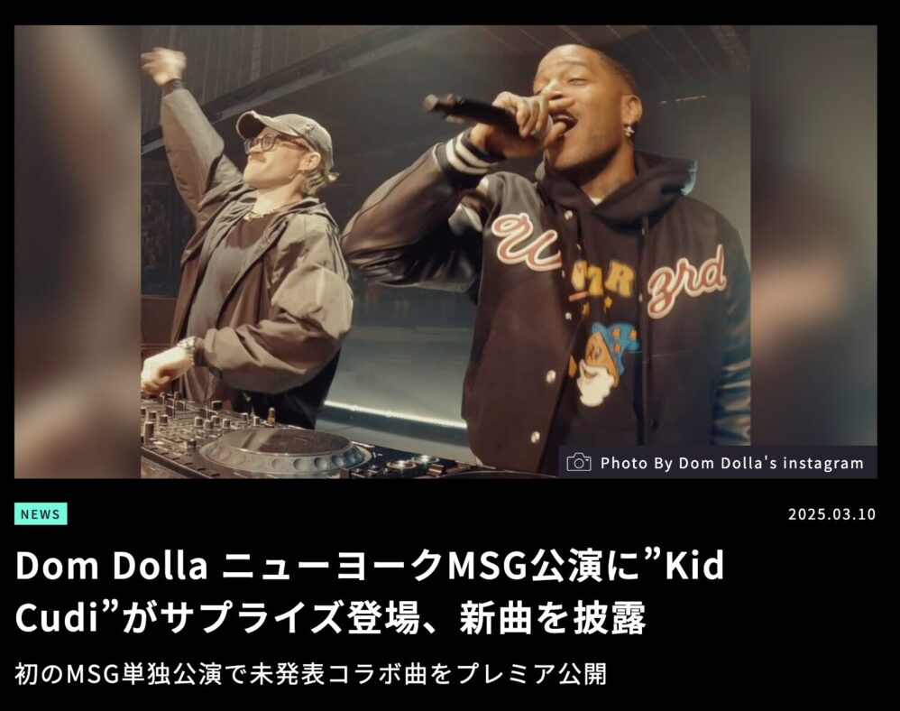 Dom Dollaは近年、Ultra Music Festival、Coachella、Tomorrowland、Lollapalooza など世界有数のフェスでメインステージを次々と制覇。今年3月にはニューヨークの殿堂 Madison Square Garden で自身最大規模の単独公演を成功させ、続いて John Summit とともに ULTRA Miami のDAY1トリを務め、その勢いを不動のものとした。