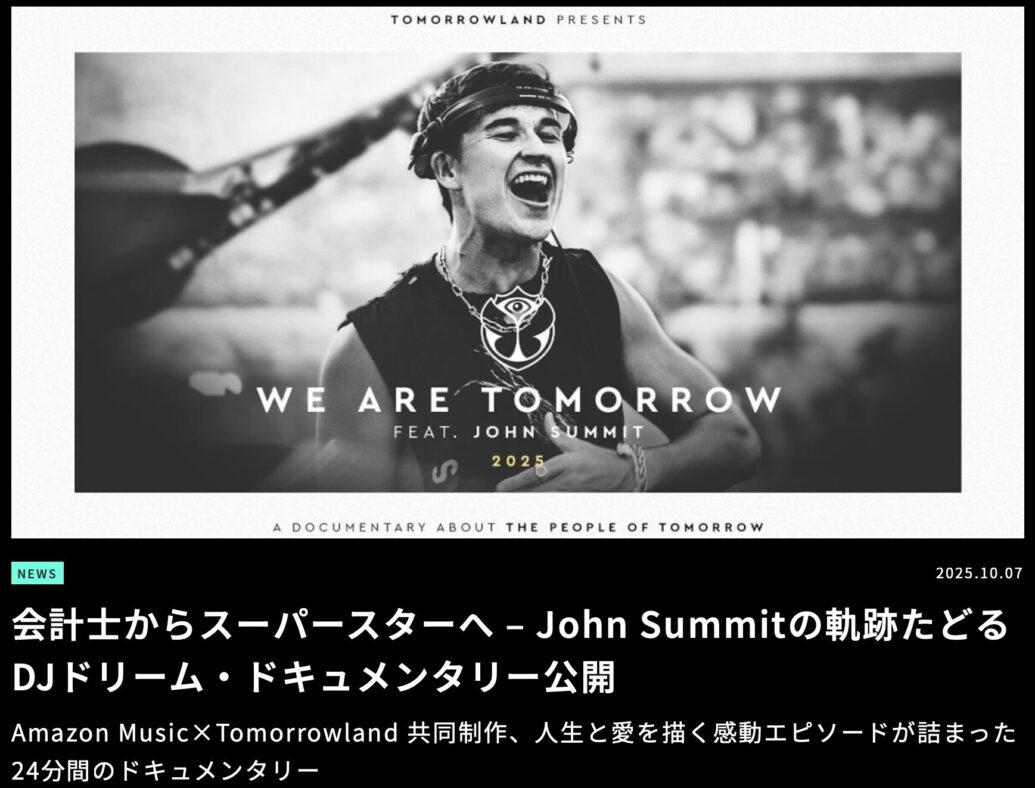 さらに、会計士から世界的スーパースターへと駆け上がったJohn Summitの軌跡を描く、Amazon MusicとTomorrowlandの共同制作によるドキュメンタリーも公開中だ。