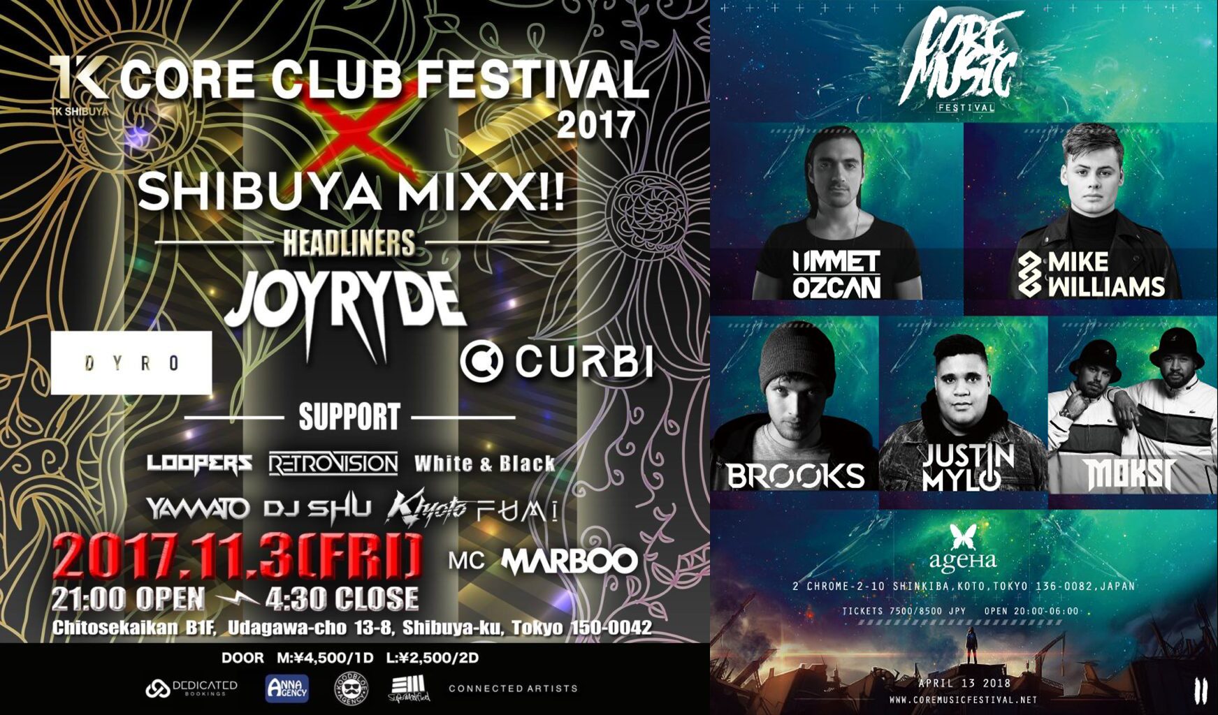 2017年、渋谷・TK NIGHTCLUBで開催された「COME MUSIC FESTIVAL 2017」には、JOYRYDE、Dyro、Curbi、RetroVision、White&Black、LOOPERSが名を連ね、翌2018年には新木場・ageHaで「CORE MUSIC FESTIVAL 2018」を実現。Ummet Ozcan、Mike Williams、Brooks、Justin Mylo、Moksiらがステージに立った。