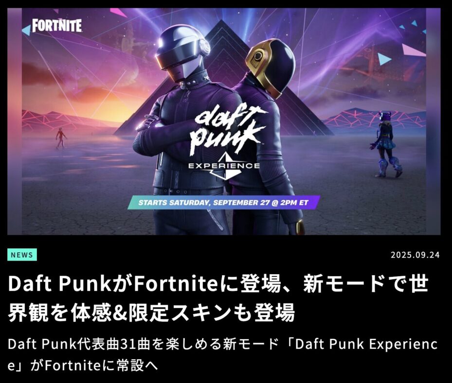 先月には Daft Punk がゲーム『Fortnite』に登場し、世界観を体感できる新モードや限定スキンが話題を集めた。