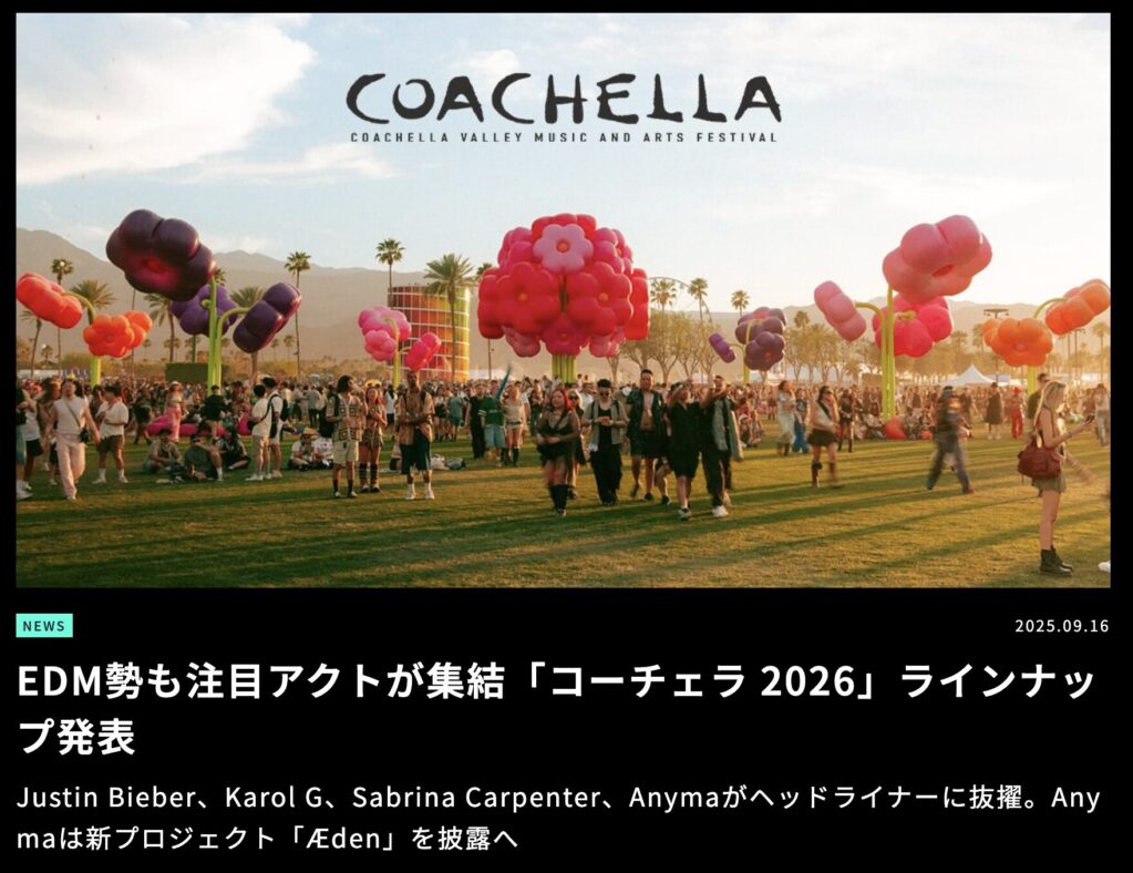 また、HUGEL は9月に発表されたコーチェラ 2026への出演も決定。Justin Bieber、Karol G、Sabrina Carpenter、Anyma がヘッドライナーに名を連ね、世界的アーティストたちが集結する。詳細は以下の記事をチェック。