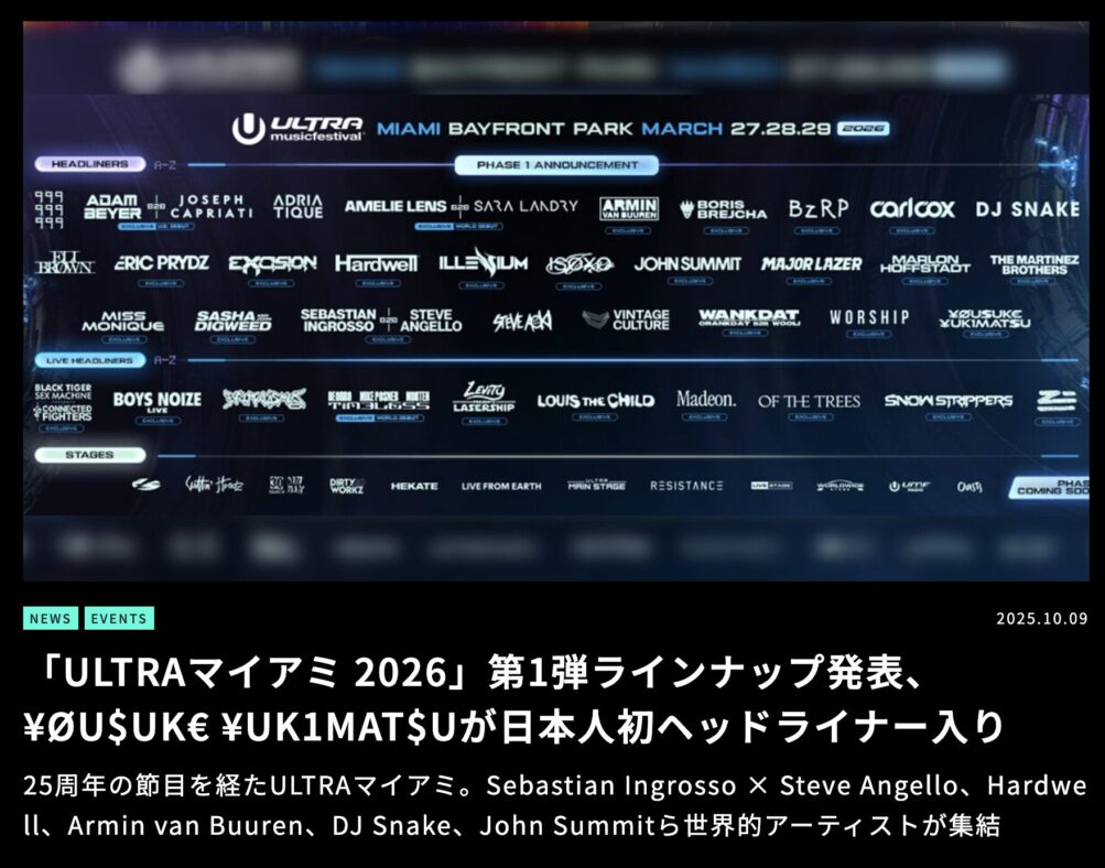 25周年を経て新章へ突入する来年は、Sebastian Ingrosso × Steve Angello、Hardwell、Armin van Buuren、DJ Snake、John Summitらが名を連ね、日本からは¥ØU$UK€ ¥UK1MAT$Uがヘッドライナーとして初選出され、大きな注目を集めている。