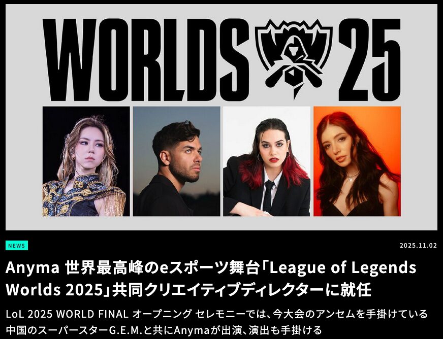 また、Anymaは世界最高峰のeスポーツ舞台『League of Legends Worlds 2025』の共同クリエイティブディレクターに就任したことでも話題に。