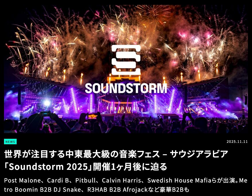 世界が注目する中東最大級の音楽フェス – サウジアラビア「Soundstorm 2025」開催1ヶ月後に迫る