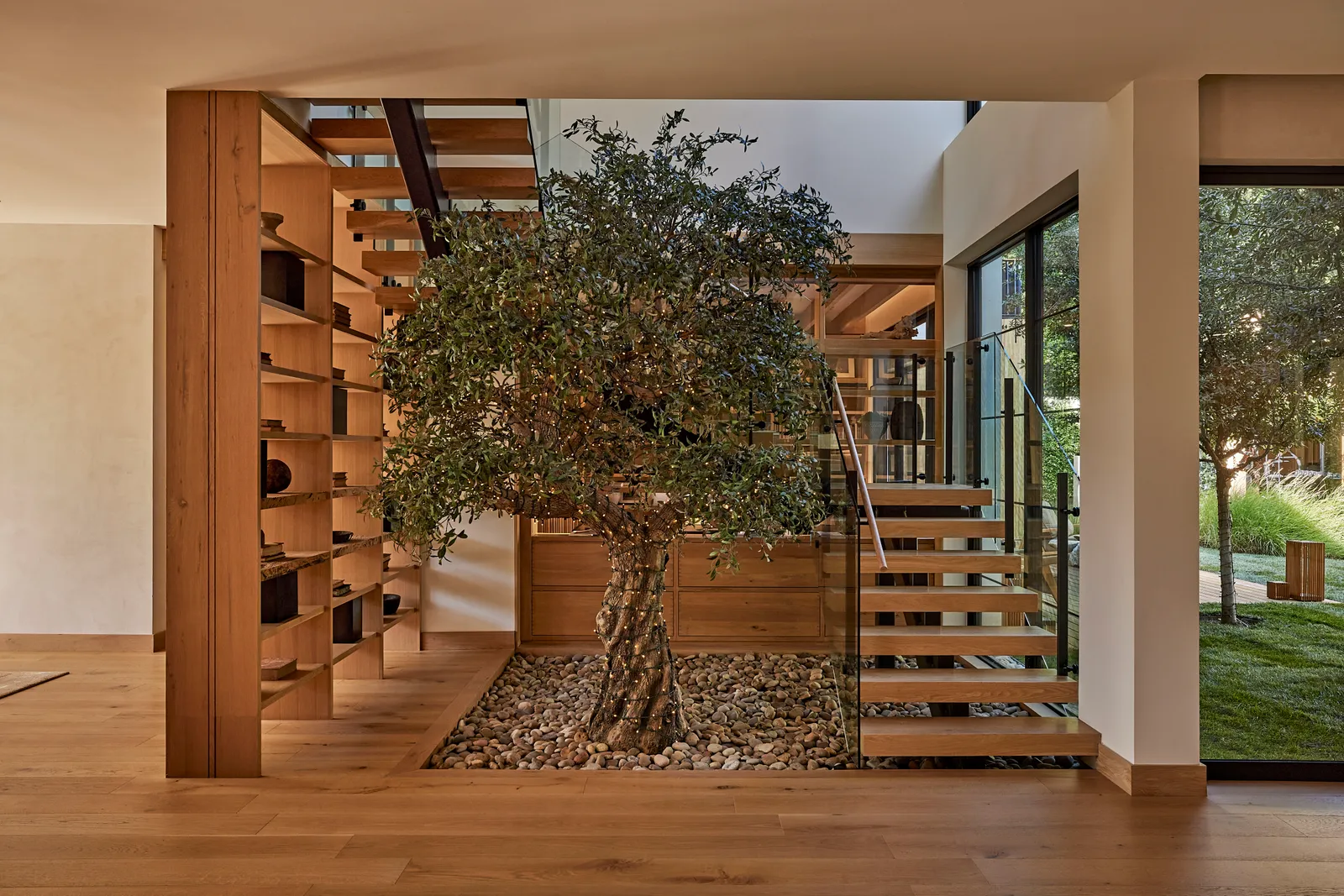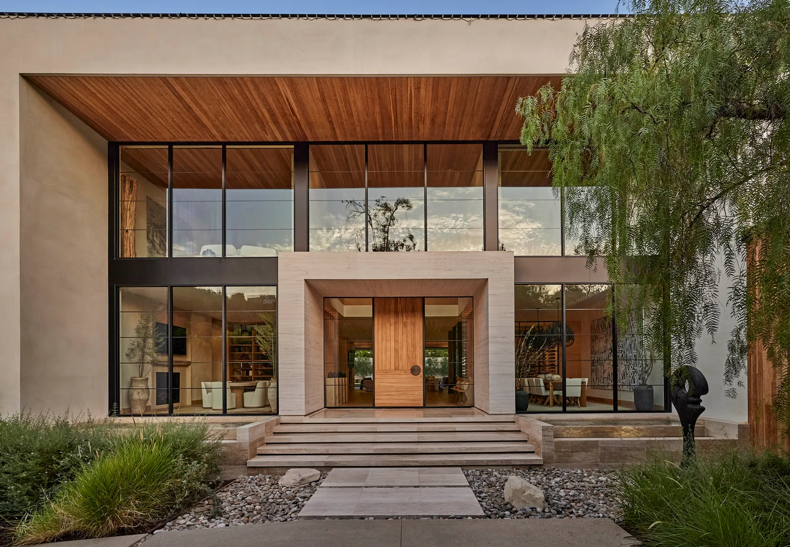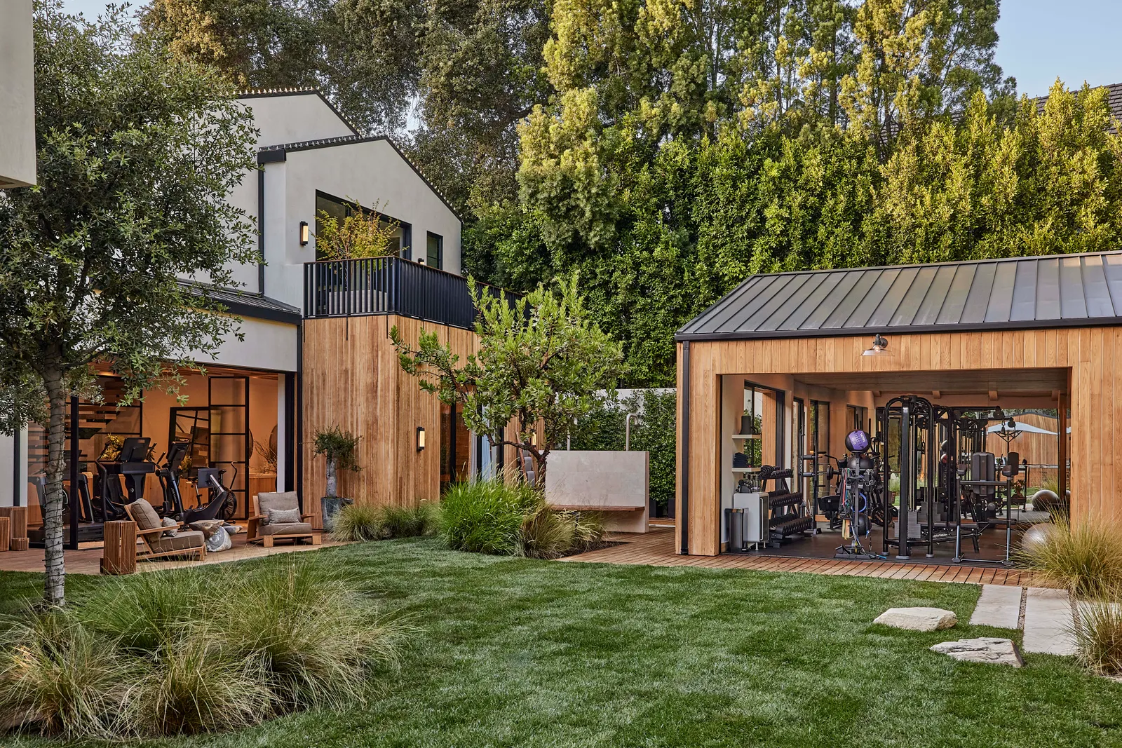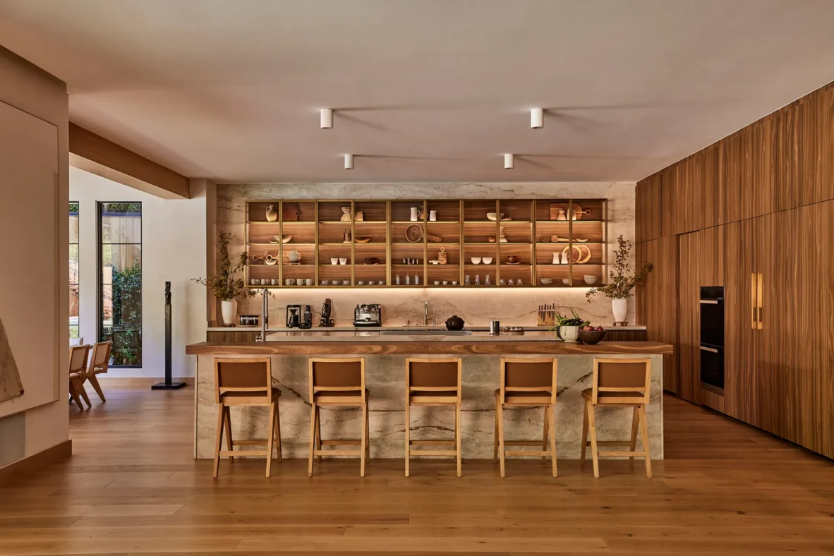 邸宅はデザイナーJae Omarと共に設計され、シンメトリーと素材統一を徹底した落ち着いた構成が特徴。映像でも、玄関ホールに並ぶ直線的な木壁や、装飾を極力排した空間づくりが際立ち、家全体に静かな一体感が生まれている。
