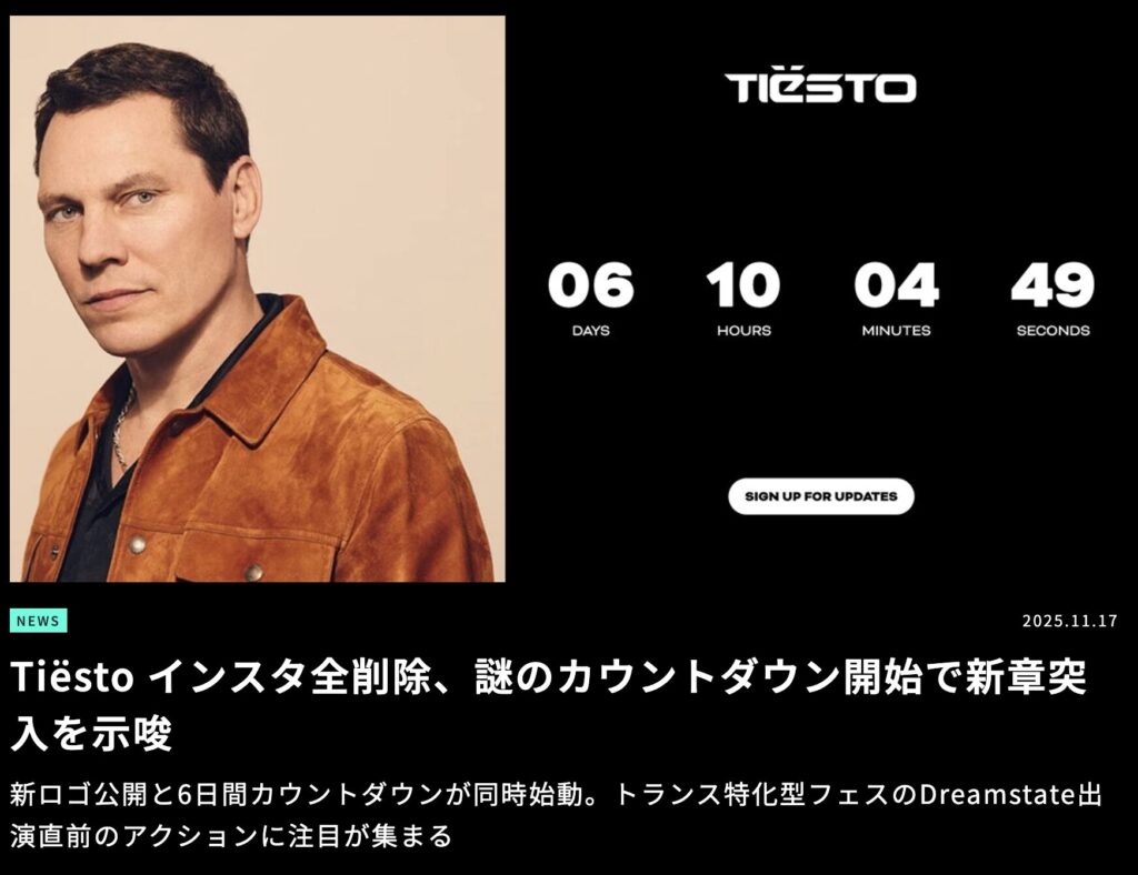 Tiëstoは11月半ばにInstagramの投稿をすべて削除し、新ロゴとカウントダウンを掲げた特設サイトを公開。その後、ティザー映像を連続で投稿し世界中の関心を集め、新曲リリースとともにトランスシーンの中心へ再び立ち返った。そして今回、その流れを象徴するステージのLIVE映像が解禁。