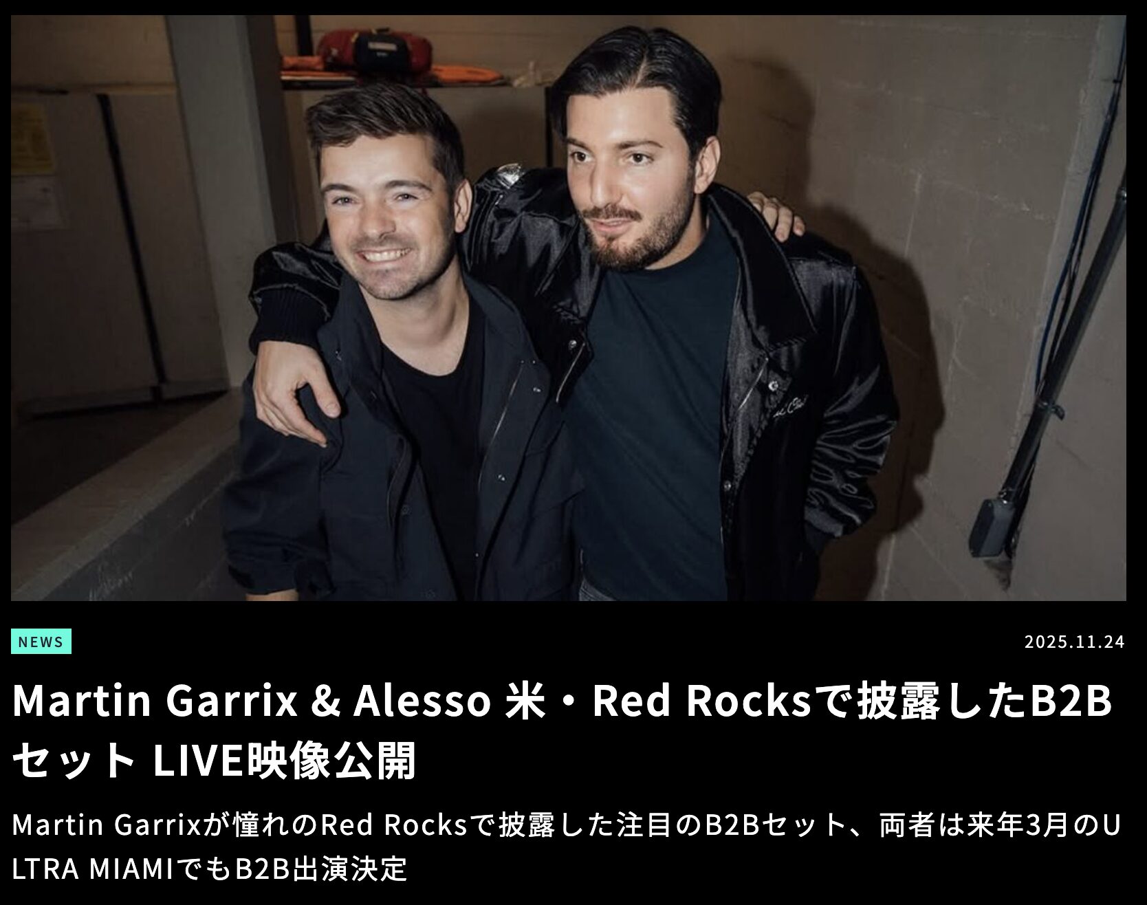 また、Martin Garrixは前述のレッドロックス公演も大きな話題を集めており、このステージではAlessoとのB2Bセットも披露。本パフォーマンスについては、以下の記事をチェック。