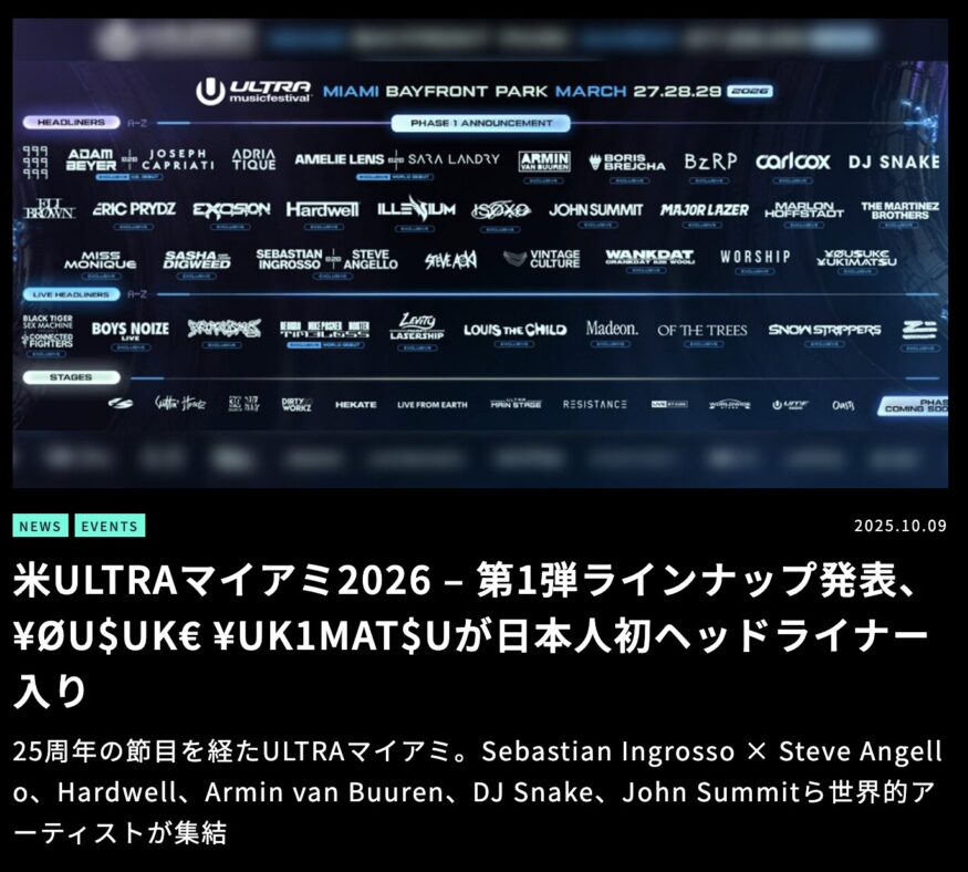 また、ULTRAの本祭となる「Ultra Music Festival」は、2026年3月27日から29日にかけて米マイアミで開催予定。すでに第2弾ラインナップまで発表されており、25周年の節目を経た開催となる同フェスには、豪華アーティストの出演が決定している。