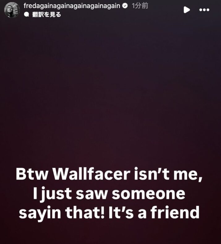 なお、コラボレーターであるWallfacerは、これまで目立ったリリース歴やキャリアがほとんど知られておらず、楽曲公開直後にはファンの間で「これはFred again..の変名なのではないか?」という憶測も広がった。しかしこの推測に対し、Fred again..本人がSNS上で明確に否定。Wallfacerについて「彼は友人だ」と説明し、自身の別名義ではないことをはっきりと示している。