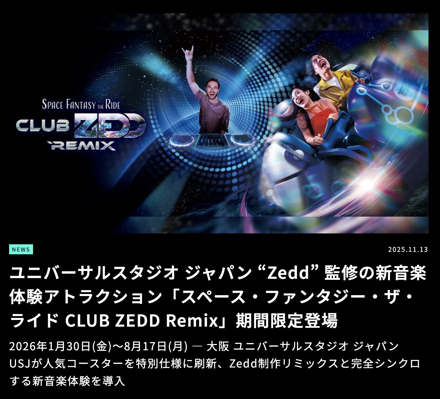WEBサイト : https://www.usj.co.jp/web/ja/jp/events/space-fantasy-the-ride-club-zedd-remix