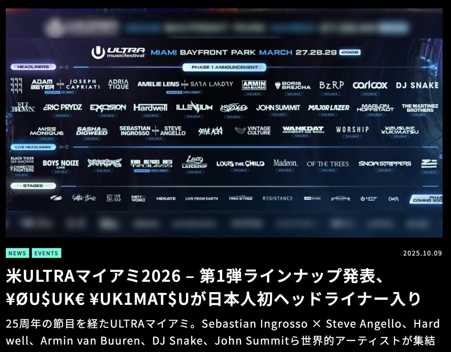 同フェスにはAlesso、Martin Garrixをはじめ、Sebastian Ingrosso × Steve Angello、Hardwell、Armin van Buuren、DJ Snake、Afrojack、John Summit、Major Lazerらが名を連ねる。日本からは¥ØU$UK€ ¥UK1MAT$Uがヘッドライナーとして初選出。詳細は関連記事をチェック。