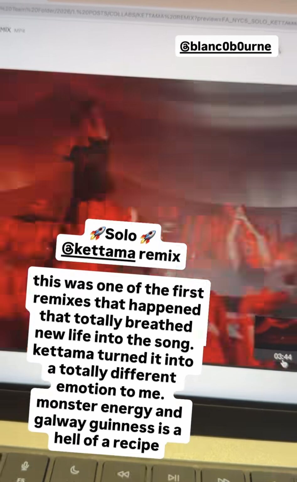 「これはかなり初期にできたリミックスのひとつで、この曲に完全に新しい命を吹き込んでくれた。KETTAMAはこれを、自分にとってまったく違う感情の曲に変えた。モンスター・エナジーとゴールウェイで飲むギネスビール (KETTAMAの持つ爆発力とアイリッシュな土臭さを、Fredがユーモラスに表現)、その組み合わせはとんでもないレシピだよ」