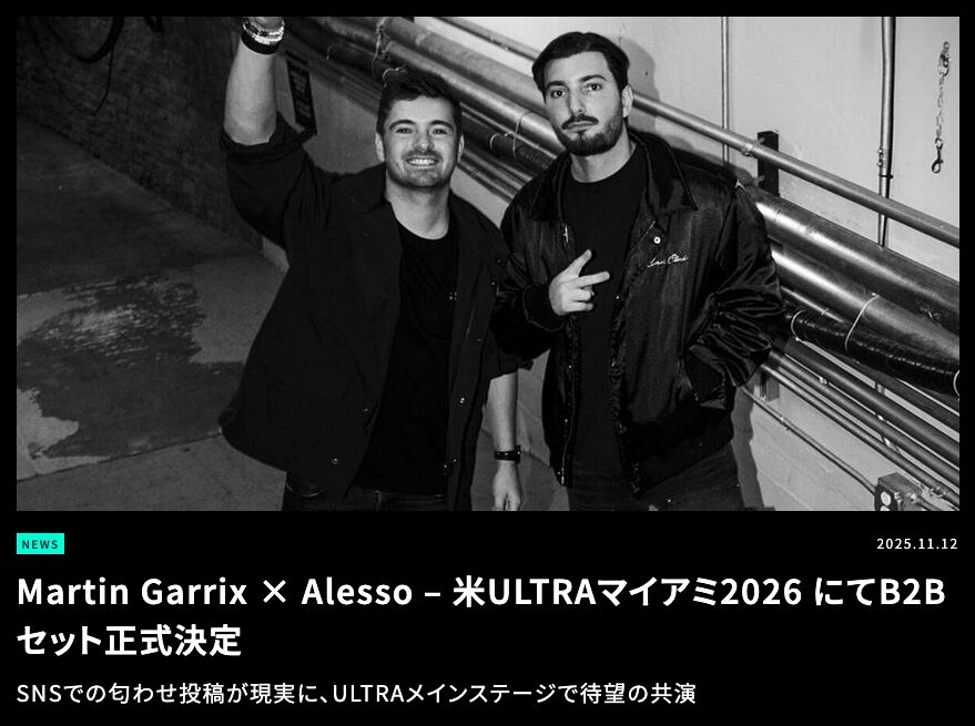 今後、Alessoは2026年3月27日〜29日にマイアミで開催される『Ultra Music Festival 2026』への出演が決定している。 今回はMartin GarrixとのB2Bセットを披露することが発表され、大きな話題を集めている。