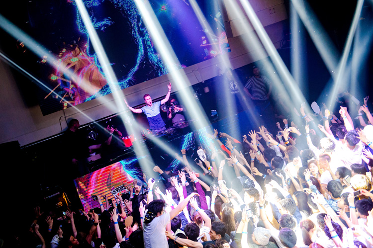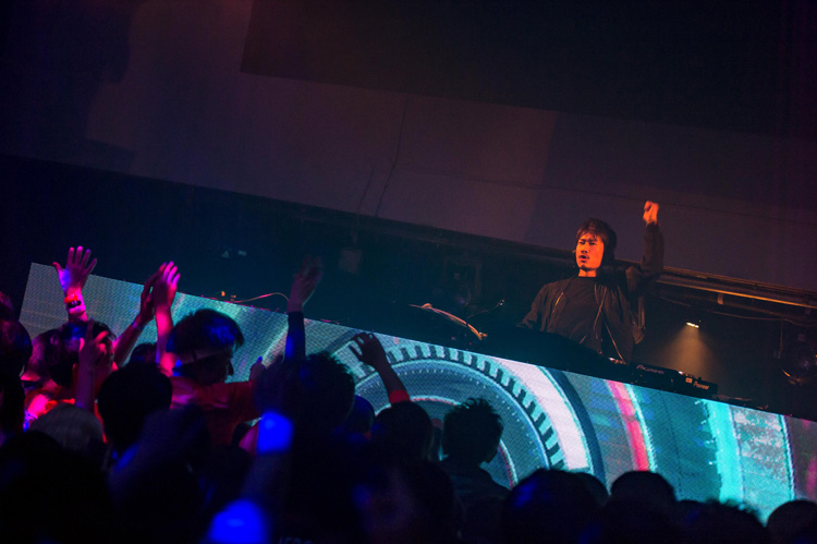 セットリストはヴォーカルトラックとアグレッシブなインストものを、ほぼ交互というスタイル。前半のハイライトは、やはり彼の代表曲であるボルト&ステイトとコラボの「Warrior」で大盛り上がり。会場全体が大合唱になった瞬間は、ライブでしか味わえない快感。