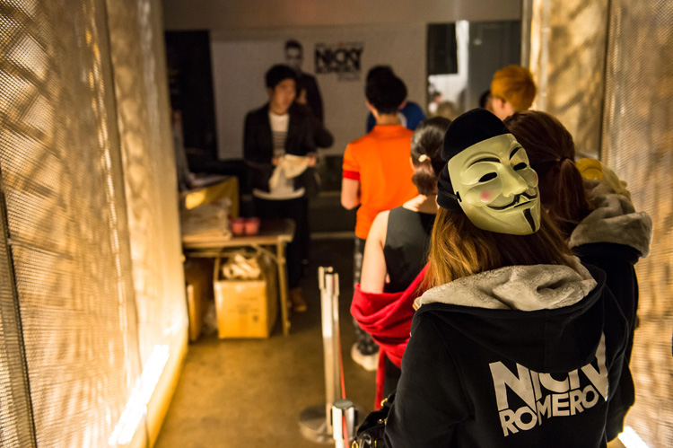 さすがニッキー・ロメロの熱狂的ファンが大集結ともなれば、例のアノニマスの仮面を被っている人(頭の後ろに被ってアクセ化したり)がいたり、ニッキーの写真やロゴをボードにしたり、フラッグにしたり、お手製の小物持参のファンも多くて、スーパースターを出迎える熱気はムンムン!